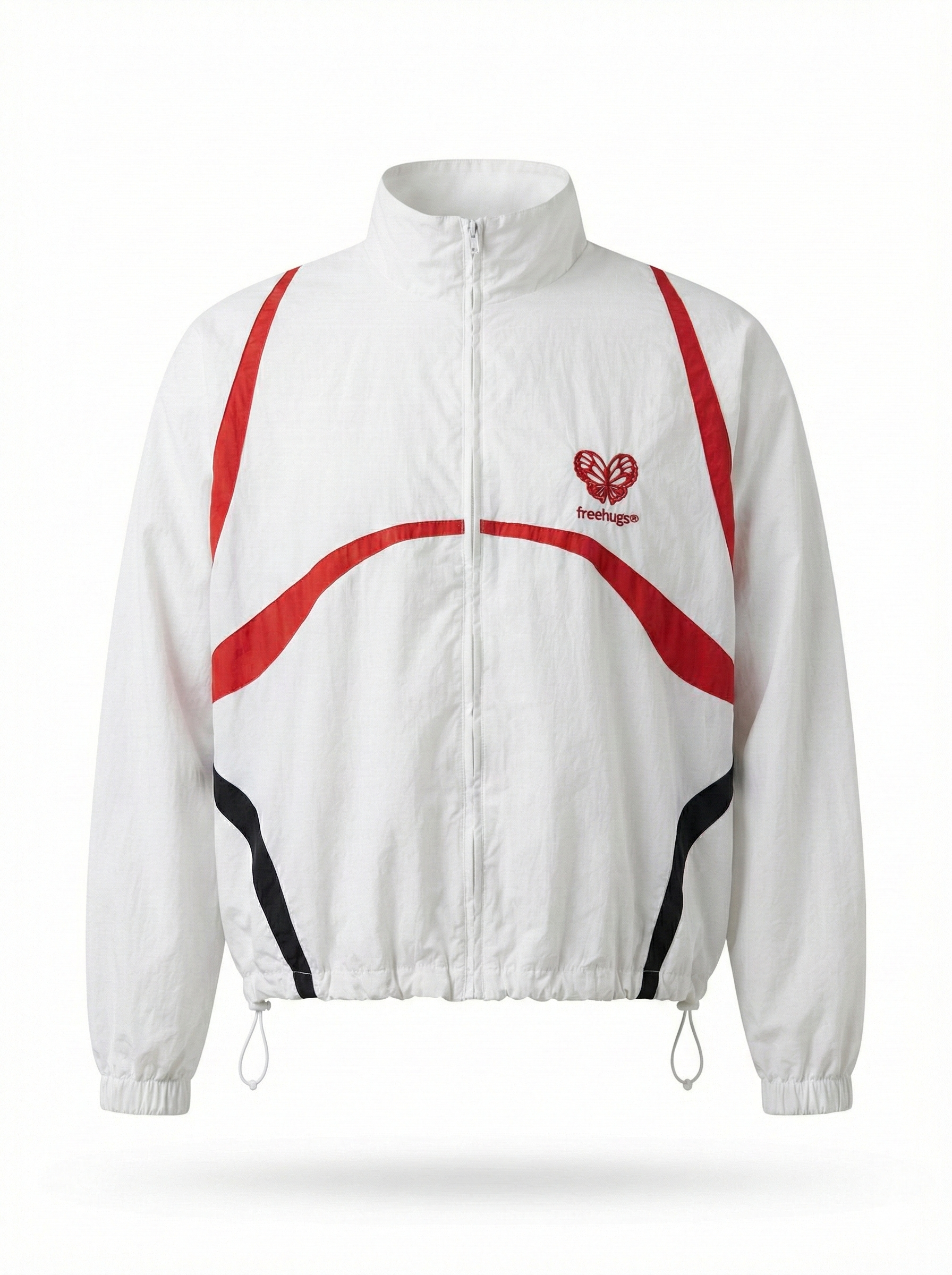 finished with contrast red and black panel detailing and a high definition embroidered free hugs logo on the chest.