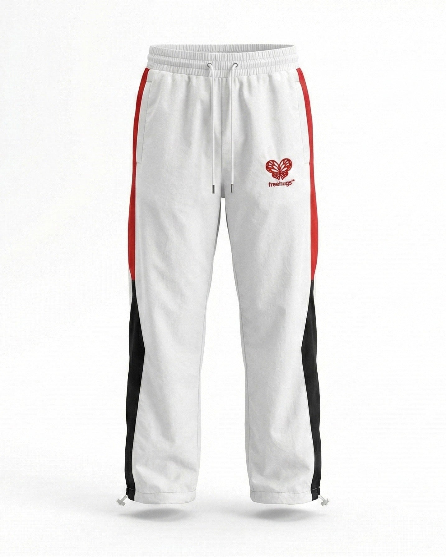 finished with contrast red and black panel detailing and a high definition embroidered free hugs logo on the thigh.